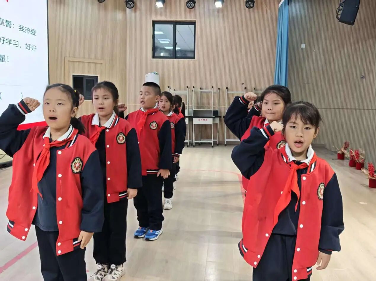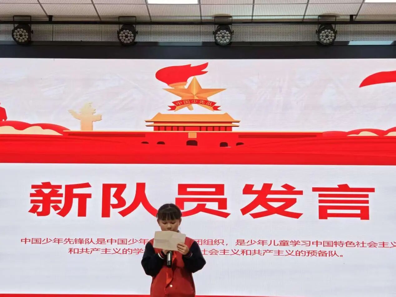 新队员代表余同学发言:课堂上我们专心听讲、勤于思考;校园里与同学互帮互助、温暖同行。严格遵守校规校纪,尊敬师长,言行文明。每天认真佩戴并爱护红领巾,让她激励我们不断进步。积极参与集体活动,勇于担当,乐于奉献,争做全面发展的优秀少先队员,共同创造更美好的校园!