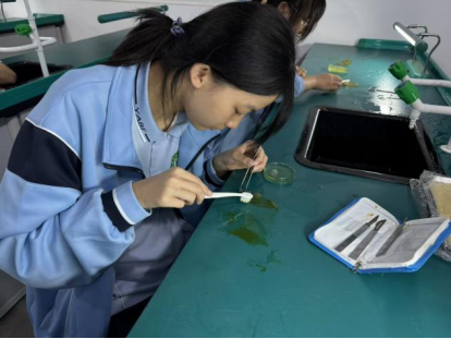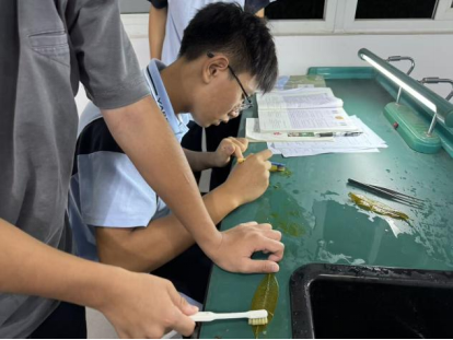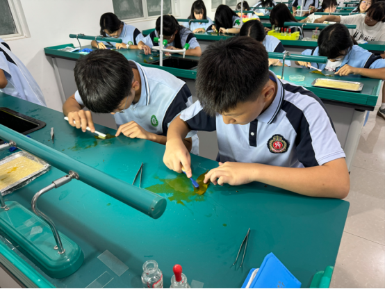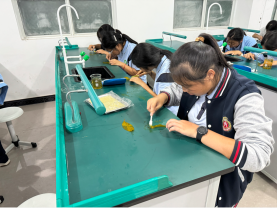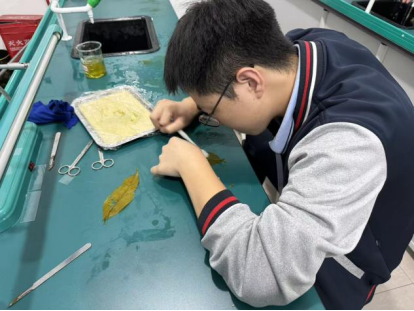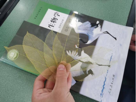 教室里,同学们按步骤操作:先夹起沸水煮软的树叶,再蘸水轻刷叶肉防破损,最后将洗净的叶脉夹进书本。桌上氢氧化钠溶液瓶、待处理的树叶整齐归位,大家边做边交流,在手工中触摸植物结构。
