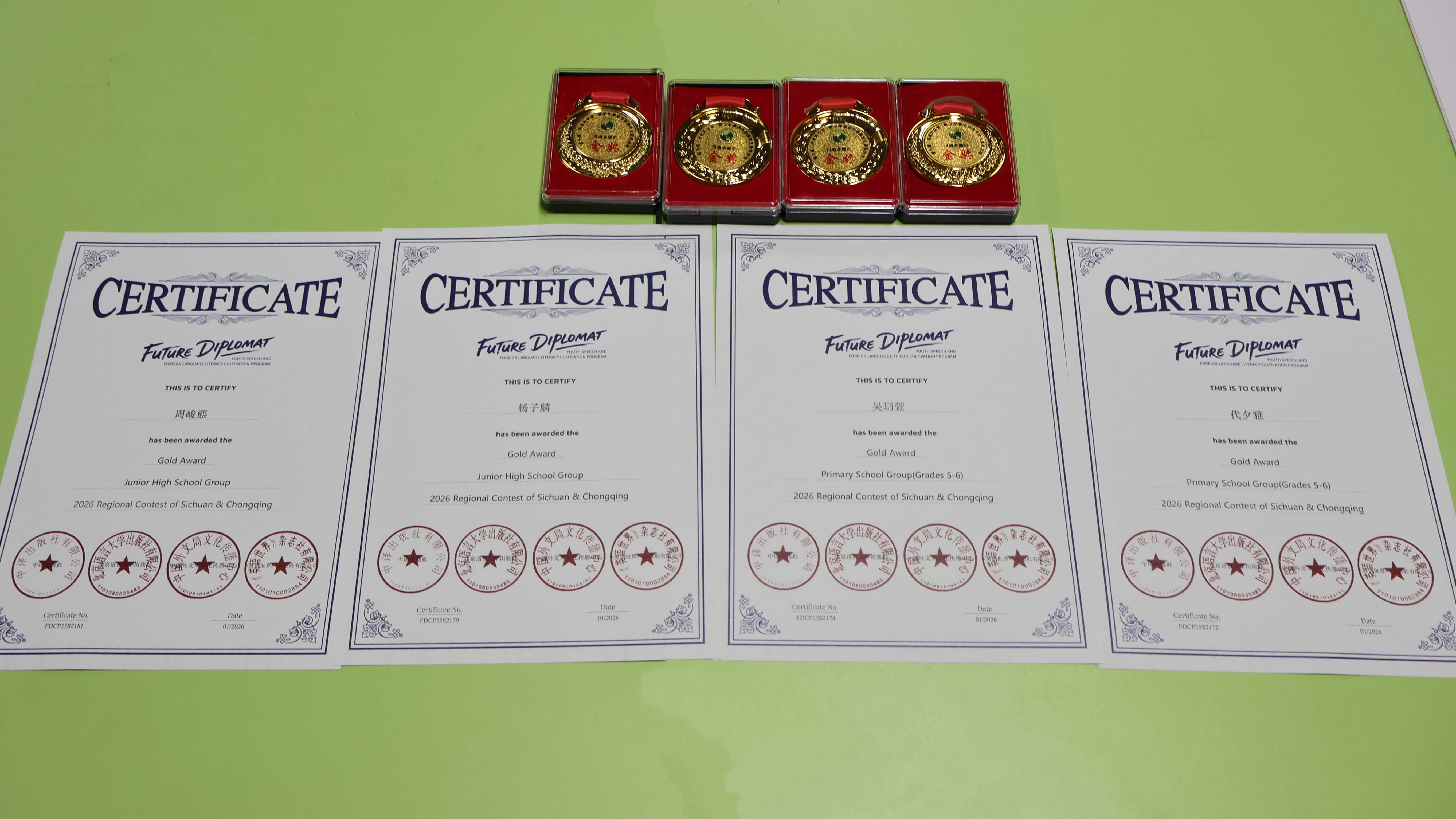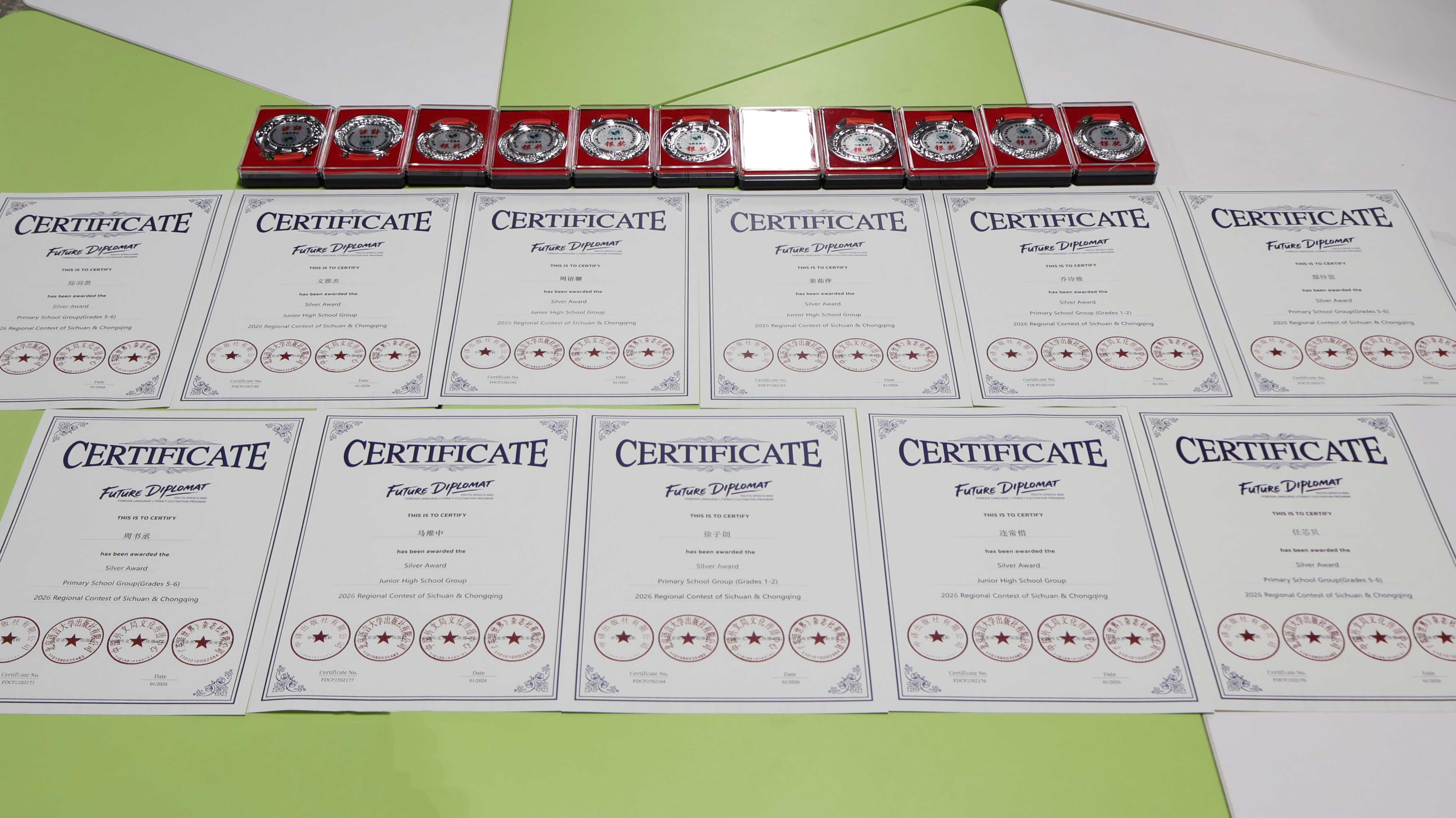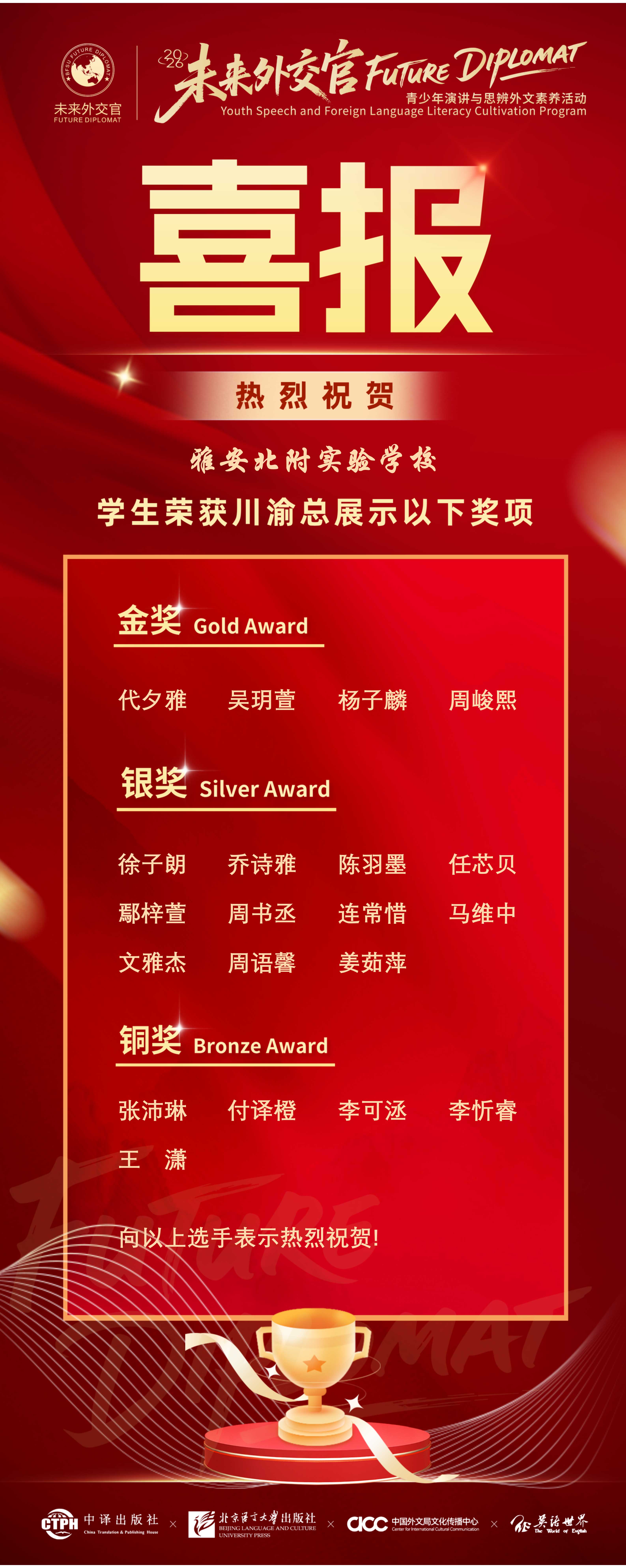 在刚刚结束的英语“未来外交官”青少年演讲与外语素养展示活动川渝地区总决赛中,我校学子凭借出色的语言表达能力、稳健的台风和扎实的综合素养,斩获多项殊荣,展现出北附学子卓越的英语水平与青春风采。