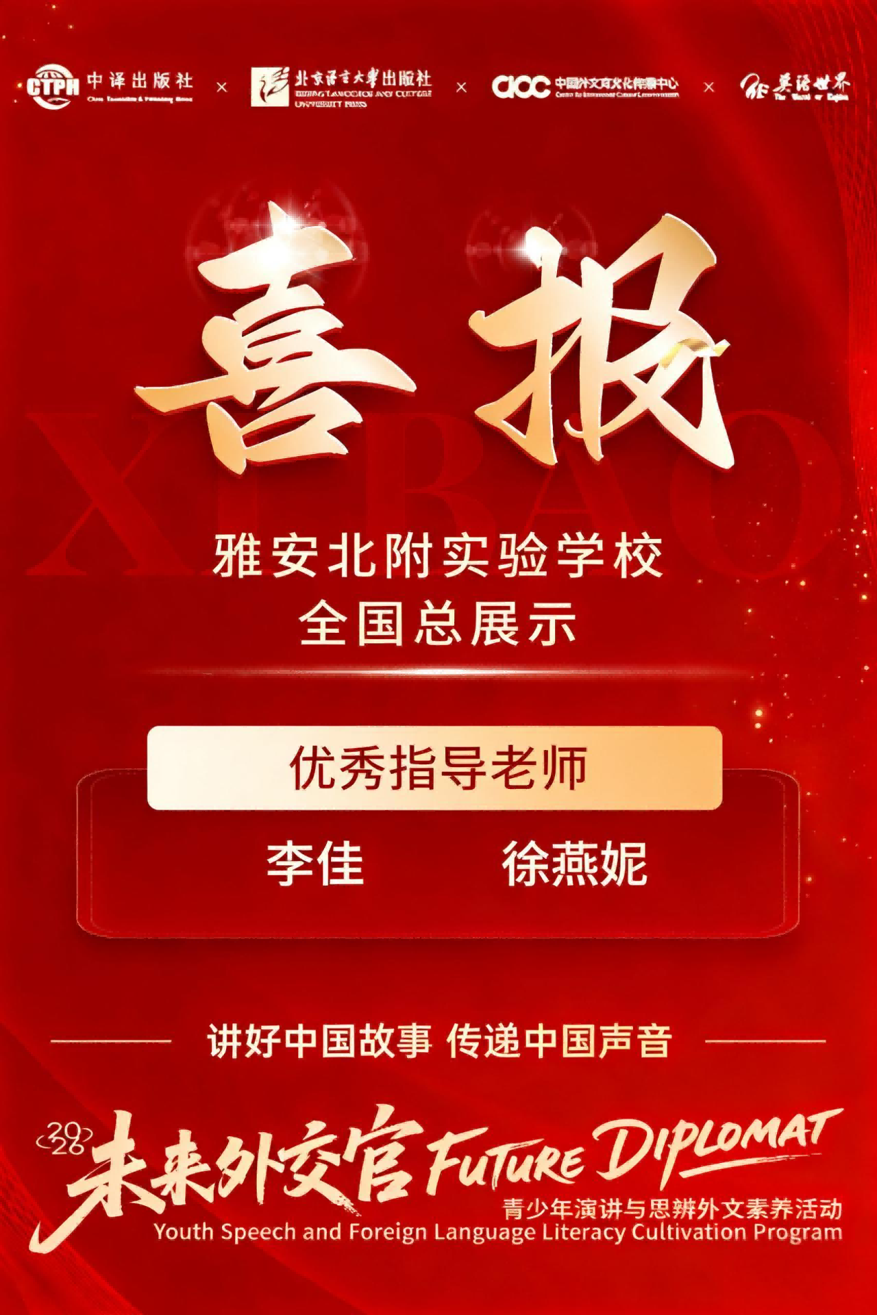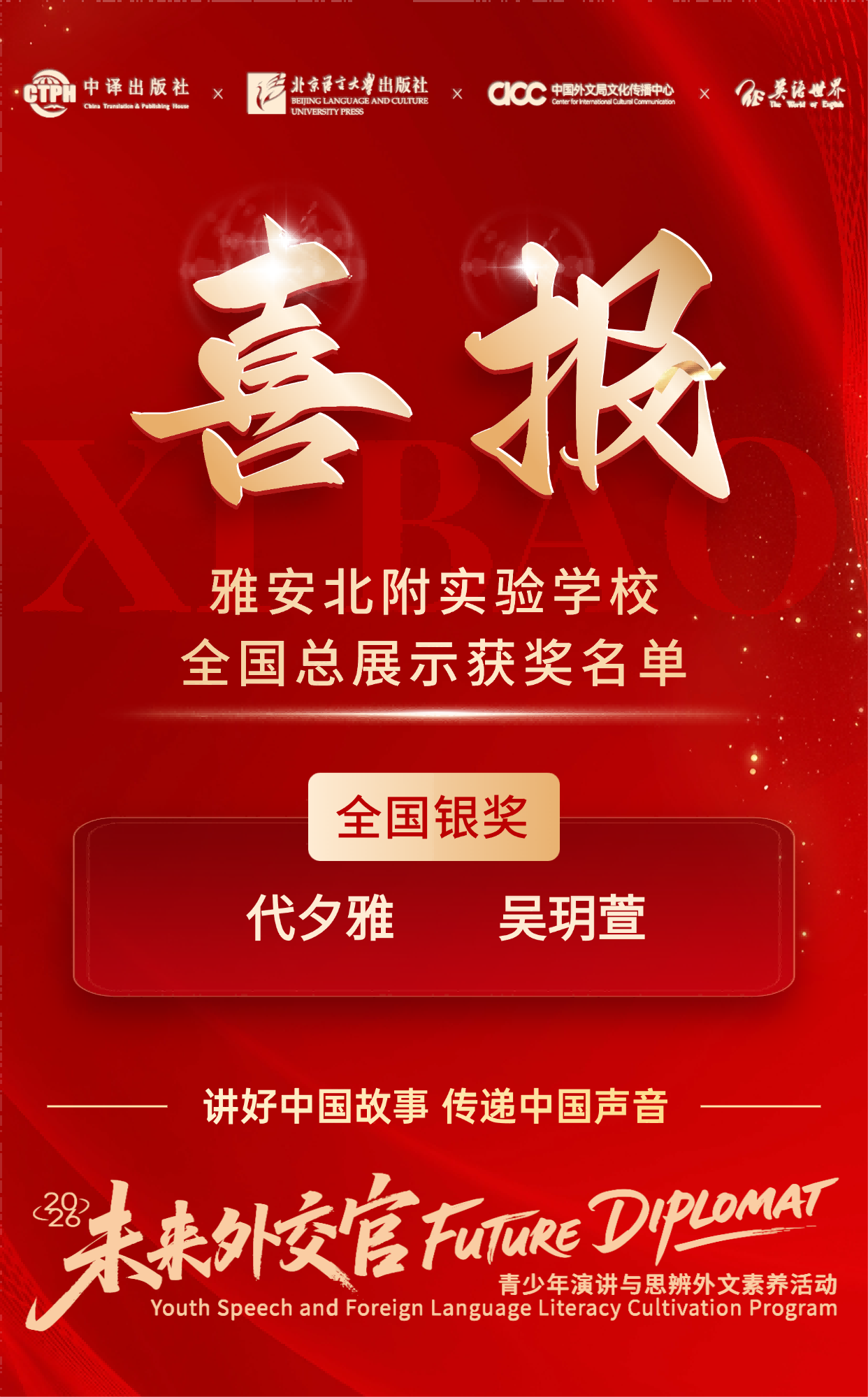 2 月 22 日 —25 日,第九届 “未来外交官” 青少年外文素养全国总展示在北京举行。我校代夕雅、吴玥萱同学与全国 29 个选区 1500 余名选手同台竞技,凭借流利外语、缜密思辨与深厚家国情怀,荣获全国银奖,完美诠释 “讲好中国故事,传递中国声音”,李佳老师,徐燕妮老师荣获全国赛优秀指导教师。